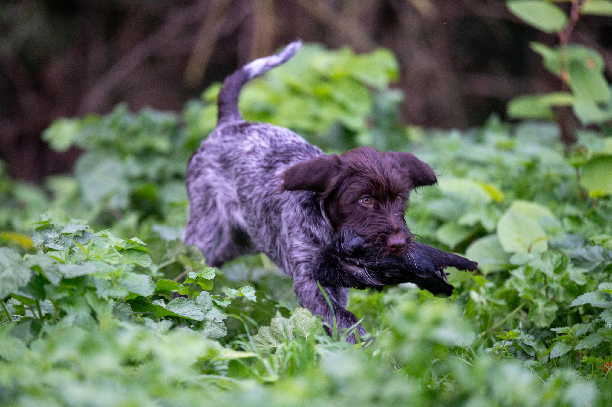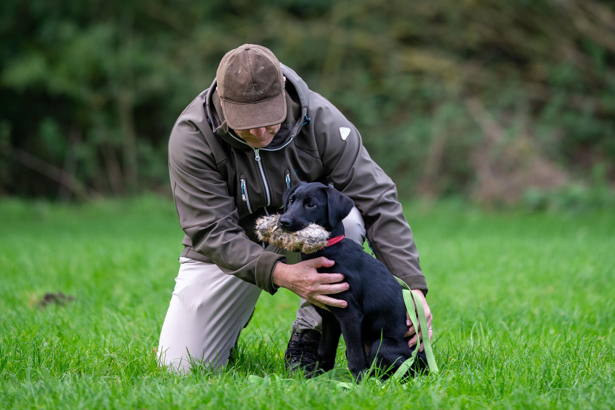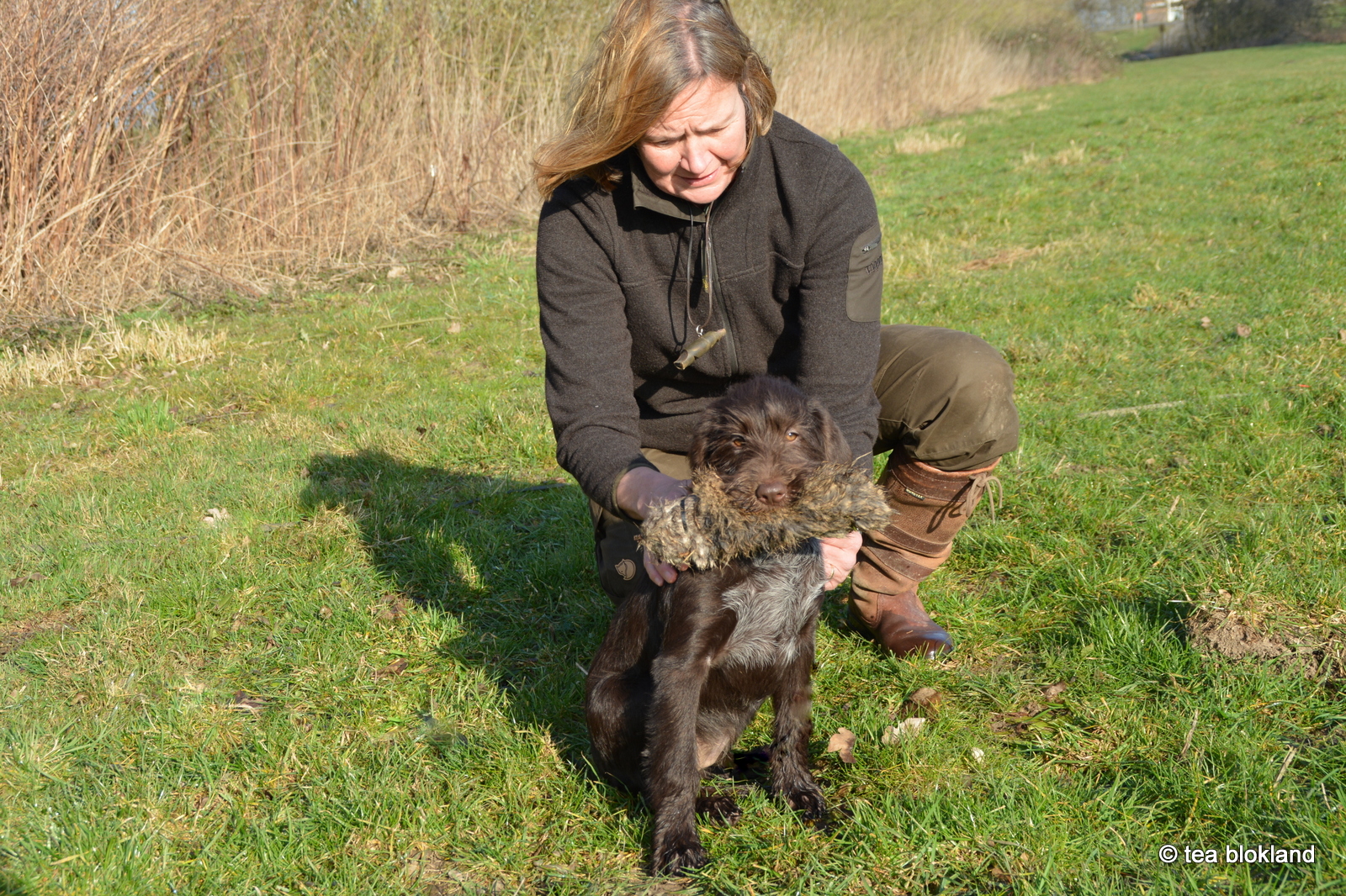 We kijken wat de natuurlijk apporteeraanleg van de pup is. Wel leren we de pups gelijk rust bij. Ook proberen we de dummy zo netjes mogelijk af te laten geven. Alles gebeurt natuurlijk zonder dwang. Ook laten we de pups een keer een sleepje lopen en in de zomer komt er apport uit het water bij. Zo wennen de pups aan het water door ze een stukje te laten zwemmen.
